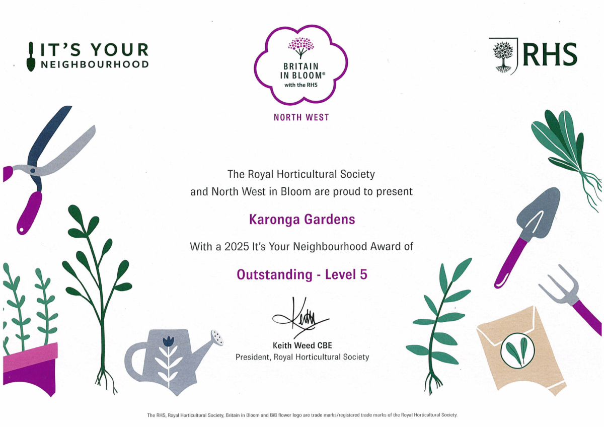 We’re thrilled to celebrate the incredible achievement of Karonga Gardens, who have been awarded Level 5 ‘Outstanding’ in the 2025 It’s Your Neighbourhood – Britain in Bloom awards!