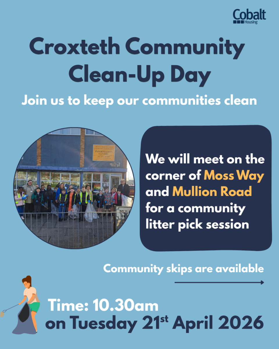 Join us for a Croxteth Community Clean‑Up Day on Tuesday 21st April, where staff from Cobalt will be joined by local councillors and neighbours to reduce fly tipping and waste across the area.